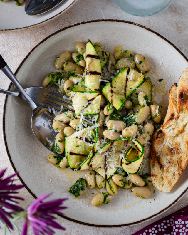 Grilled Zucchini Ribbons, White Beans & Pesto