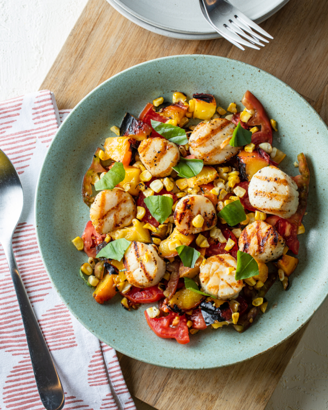 Grilled Scallops with Peaches, Corn & Tomatoes