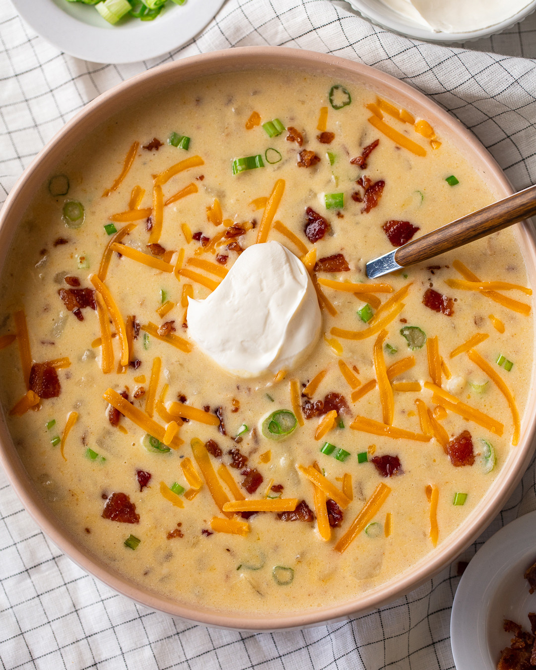 Can you imagine what would happen if you took a fully loaded baked potato and tossed it in your blender with some heavy cream and chicken stock? That’s pretty much the idea we’re going for here. You make a creamy, comforting soup that’s full of tangy cheddar cheese, chunks of soft potato, and crispy bacon — and then load up your bowl with all the best baked potato toppings, like sour cream, green onions, hot sauce, and yes, more bacon. It tastes awesome!