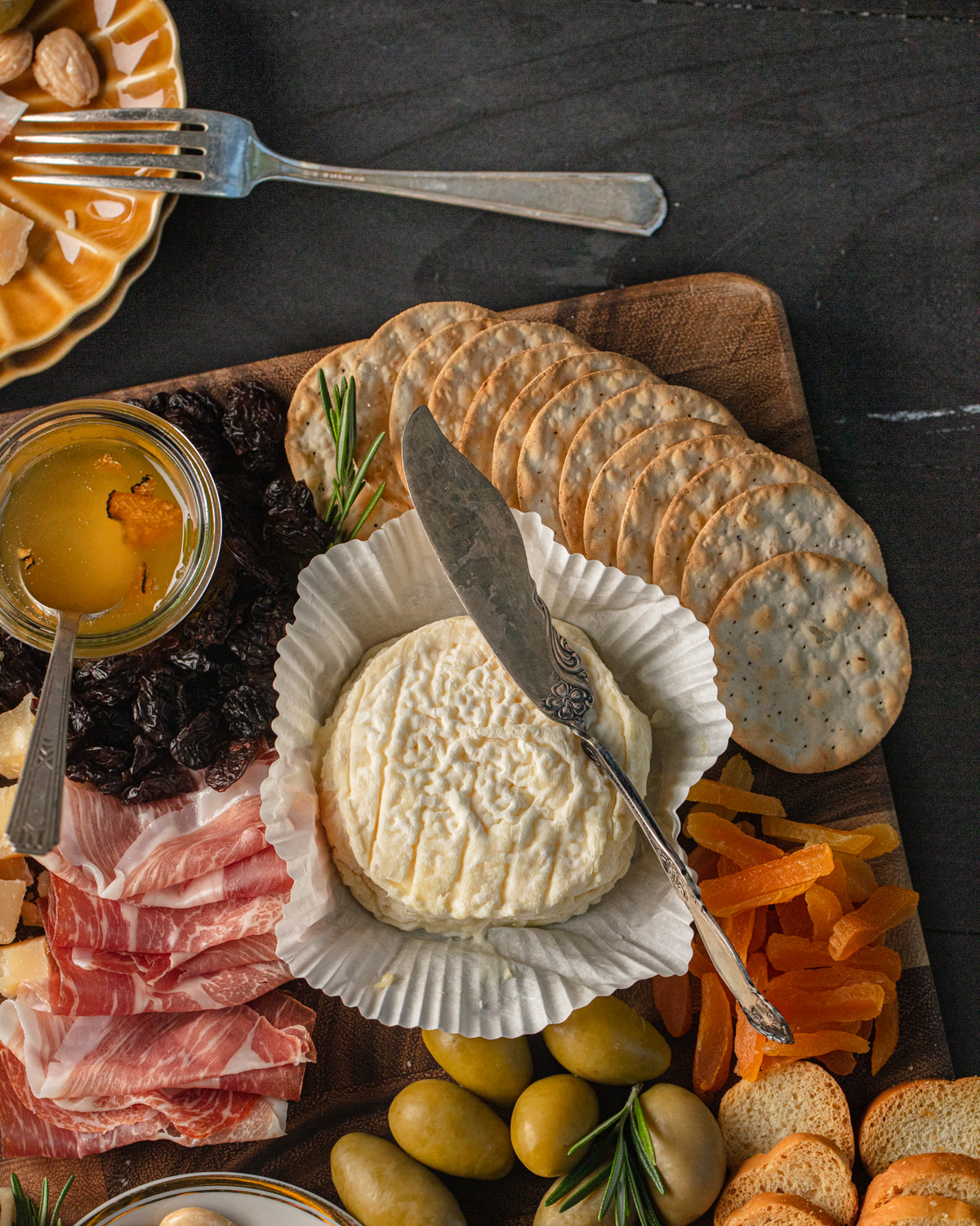 To bring out the cheeses’ nutty, sweet, sharp, and mushroom-y complexities, we’ve loaded this board up with complementary tastes, from lush prosciutto to briny green olives, crunchy herb crackers, and sweet-tart dried fruit. (See the full list below.) It’s a hearty spread, perfect for virtual get-togethers: a happy hour with your workmates, a glass of white wine with your in-laws, or an extended disco chat with a BFF or two.