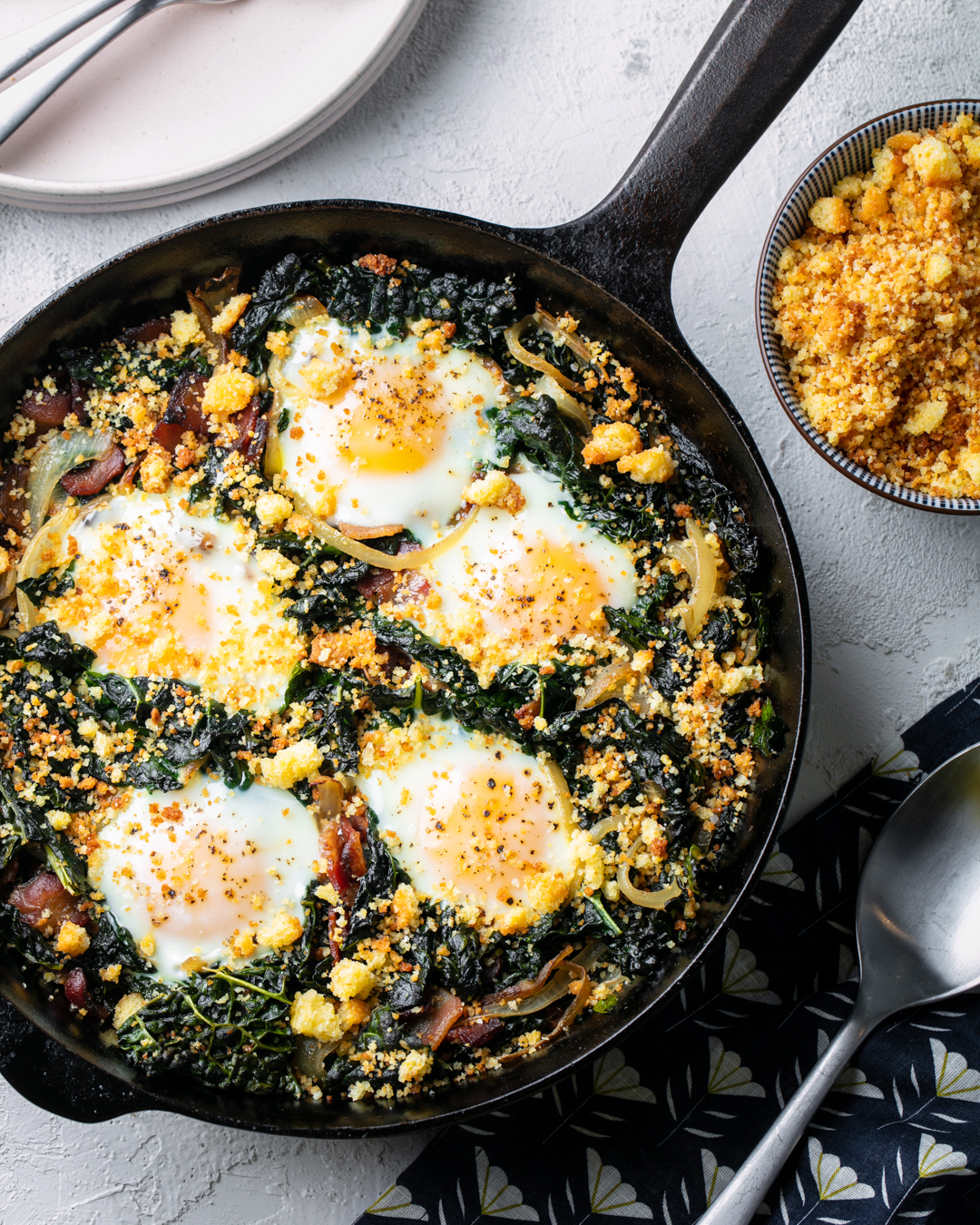This is one of those wonderfully light breakfasts that manages to feel extra luxe, thanks in part to the caramelized onions at the base of the dish. We cook them down in bacon fat, so they have a rich, earthy sweetness, a little smoke, and a silky texture. Combined with the creamy egg yolk and chewy bacon bits, they give the dish a deeply savory flavor. It all tastes so good layered in the tender kale and those toasty cornbread crumbles!
