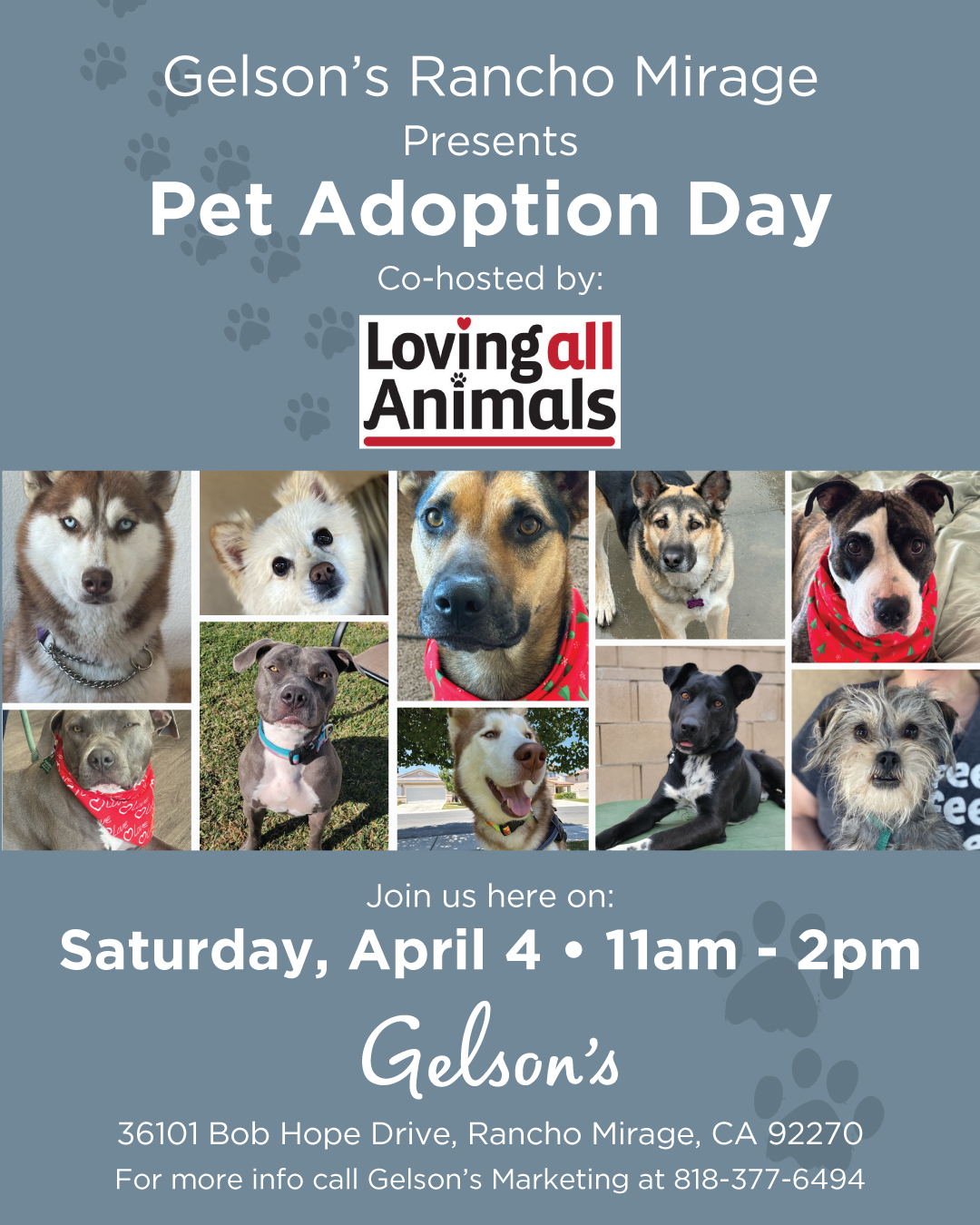 Gelson's loves animals, and we work with nearly a dozen pet rescue groups throughout various store locations. We will host a pet adoption with Loving All Animals at our Gelson's Rancho Mirage location on Saturday, April 4, 2026, from 11 a.m. to 2 p.m. If you're interested in adopting and adding a furry member to your family, please come out!