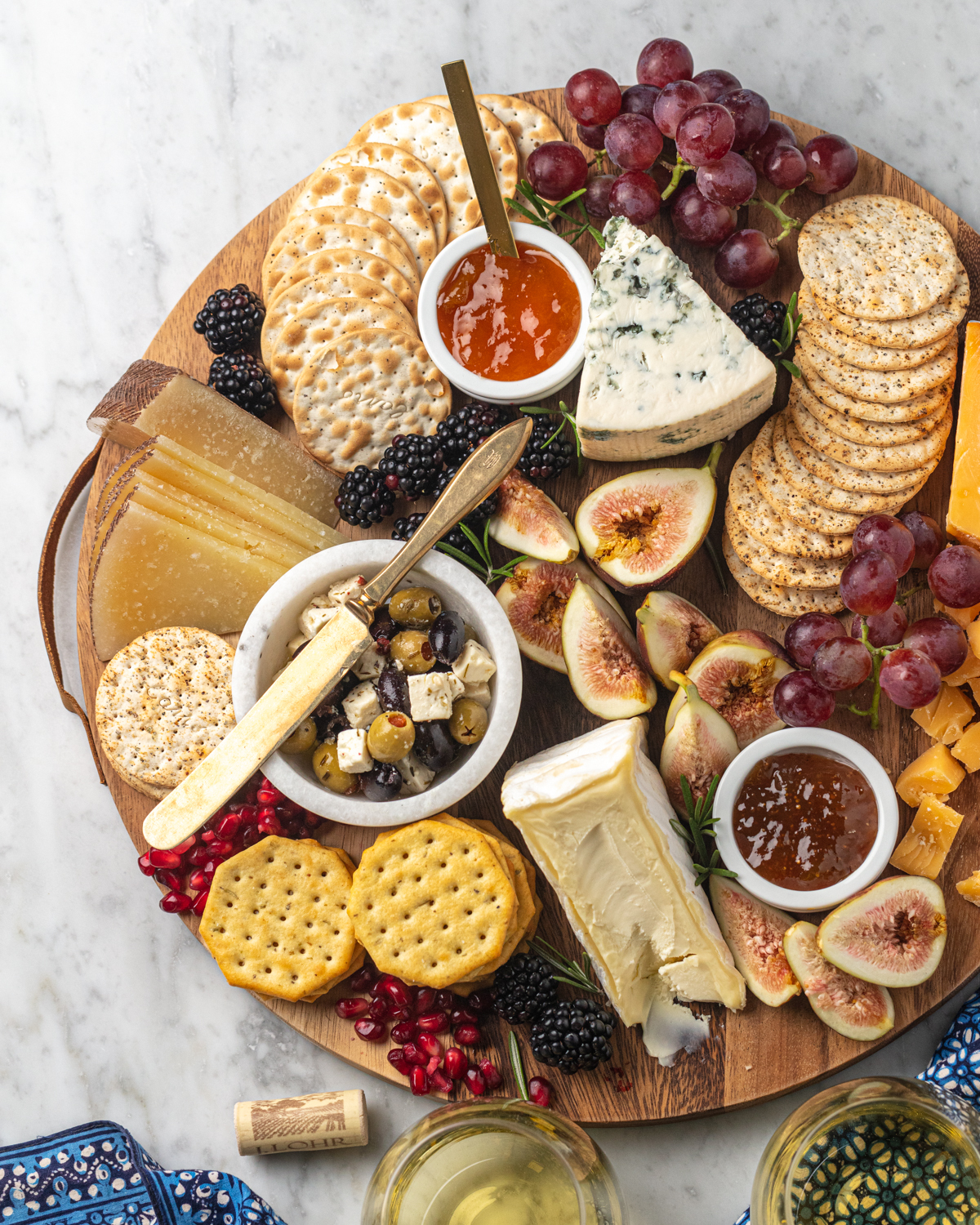 What we love about this cheeseboard is that it celebrates fresh, juicy, brightly colored late-summer fruit. It’s heavy with figs, pomegranates, blackberries, and grapes. We’ve paired them with mild cheeses that complement their fruity sweetness, from the fig’s deep, honeyed intensity to the pomegranate’s dry brilliancy. There are lots of other goodies, too, including a variety of Carr’s crackers, some preserves, and a wonderfully herby mix of marinated olives and feta.