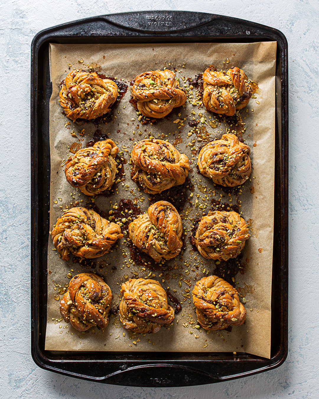 Drizzle the still-warm buns with honey and sprinkle with chopped pistachios. Serve warm or at room temperature.