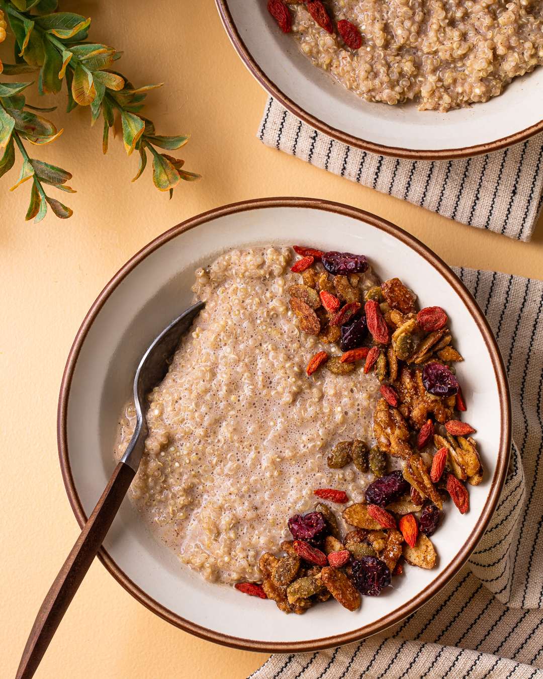 Our tip: Unlike oatmeal, quinoa stays nice and fluffy in the fridge, so it’s a great make-ahead breakfast if your mornings tend to be a bit of a hustle. Just add a little more almond milk and heat it up on the stove or in the microwave.
