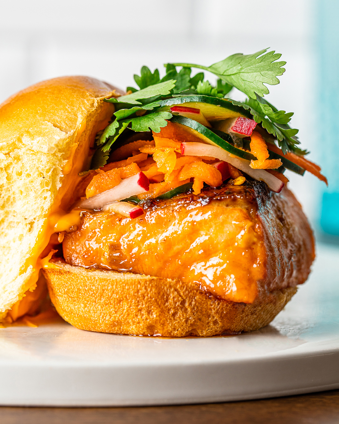 Crispy, sweet and spicy glazed salmon, bright pickled veggies, Sriracha mayo, and cilantro tucked in a pillowy brioche bun — this little slider is everything a sandwich should be! What’s its secret? Balance. It’s soft and it’s crunchy, and hidden in its layers are all the flavors a chef likes to hit: delicately sweet and acidic rice wine vinegar, salty soy sauce, tart lime, spicy chile paste, and buttery Scottish salmon with its higher fat content.