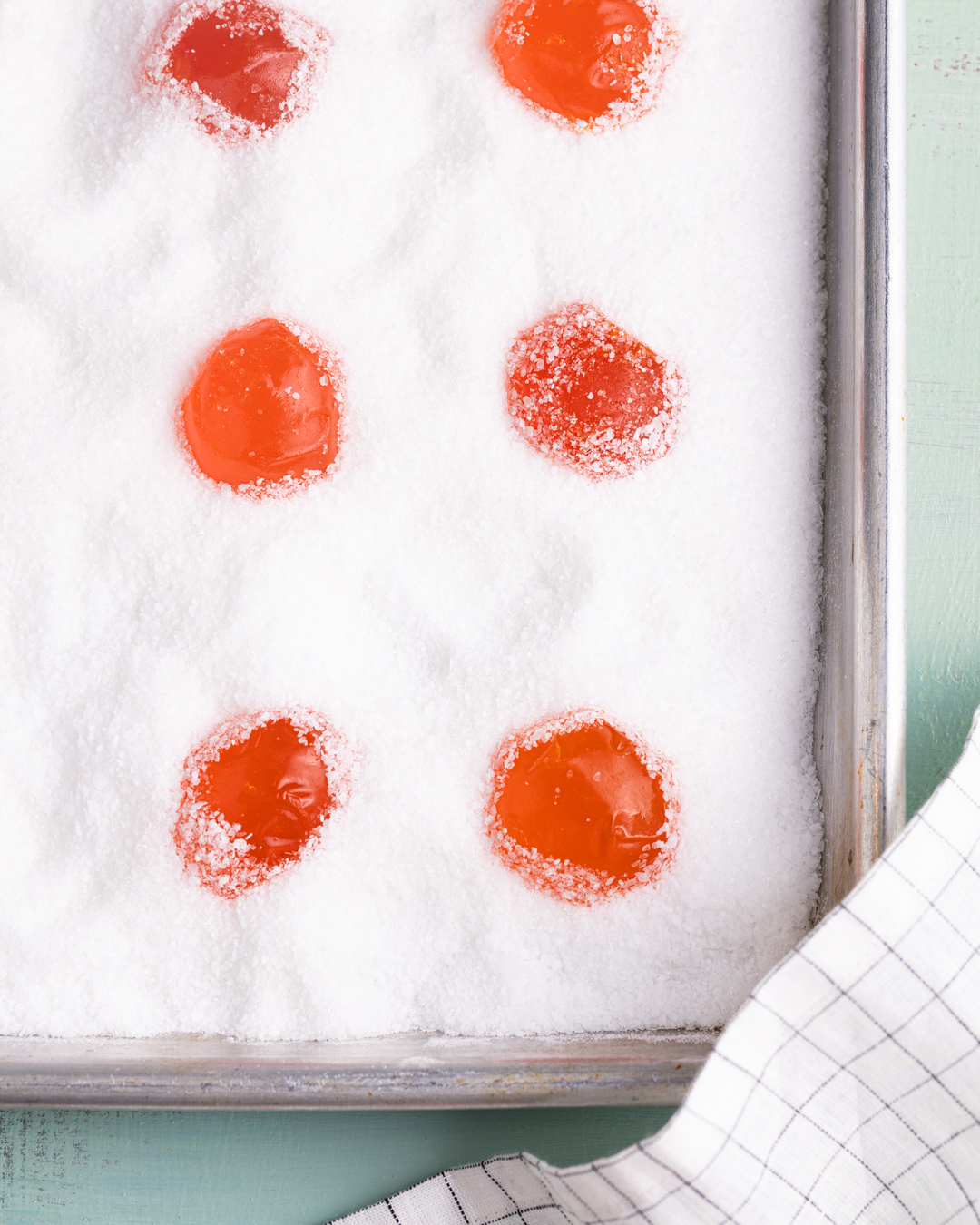 Fill a medium bowl with cool water. Working one yolk at a time, remove the yolks from the sheet pan, brush off the excess salt and sugar, and gently rinse them in the water. Using a paper towel, pat the yolks dry and transfer them to the wire rack.