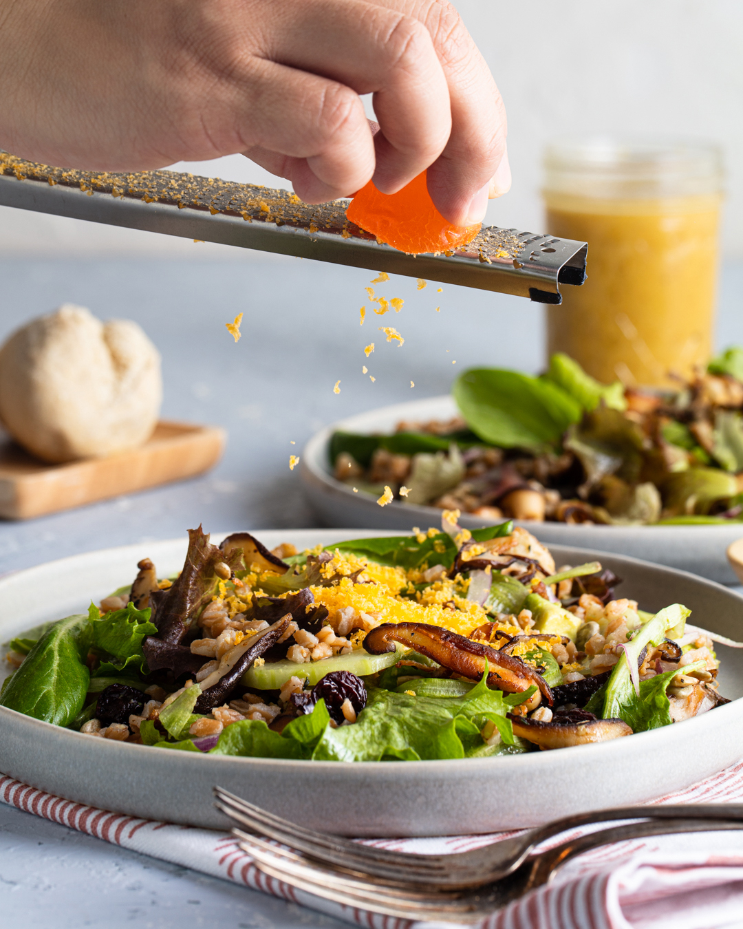 Case in point, the greens and farro salad we created here. It’s a hearty affair, heavy on the goodies that make a salad feel like a meal: mushrooms, sunflower seeds, dried cherries, cucumbers, and avocado. We’ve also loaded it up with aromatic garlic and herbs and tossed it in a honey-mustard vinaigrette, so it’s super flavorful. We love how all those chewy textures play out and the way the mustard and sweet-tart cherries foil the rich, meaty mushrooms. The cured egg yolk is shaved over the top of the salad, pulling those disparate flavors together, much like Parm — but it’s so light the little flakes melt, rich, subtly sweet, and salty in your mouth.